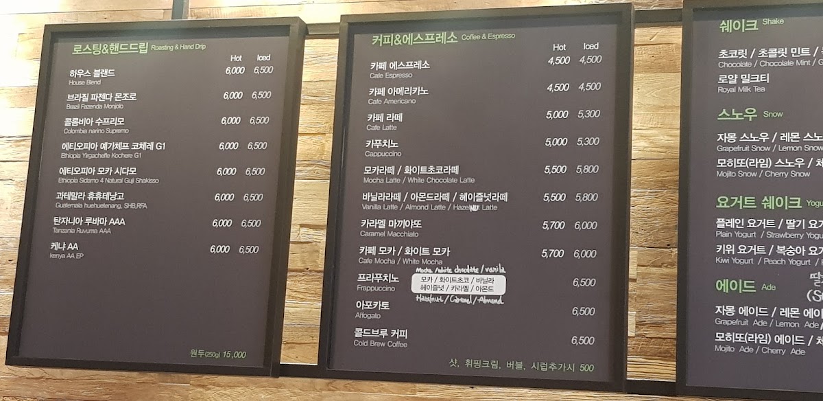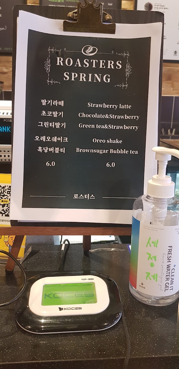 The menu at ROASTERS with Jeong Jinwon primarily features a range of coffee and specialty beverages, complemented by a selection of cakes and light snacks. Customers can choose from classic coffee options such as cappuccinos, as well as specialty lattes including hazelnut and vanilla flavors. The beverage offerings also include unique choices like Kenya AA coffee, grapefruitade, 피치에이드 (peach ade), and various frappuccino-style drinks.
